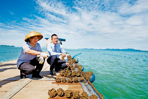 邮储银行工作人员在生蚝海上养殖基地查看养殖情况