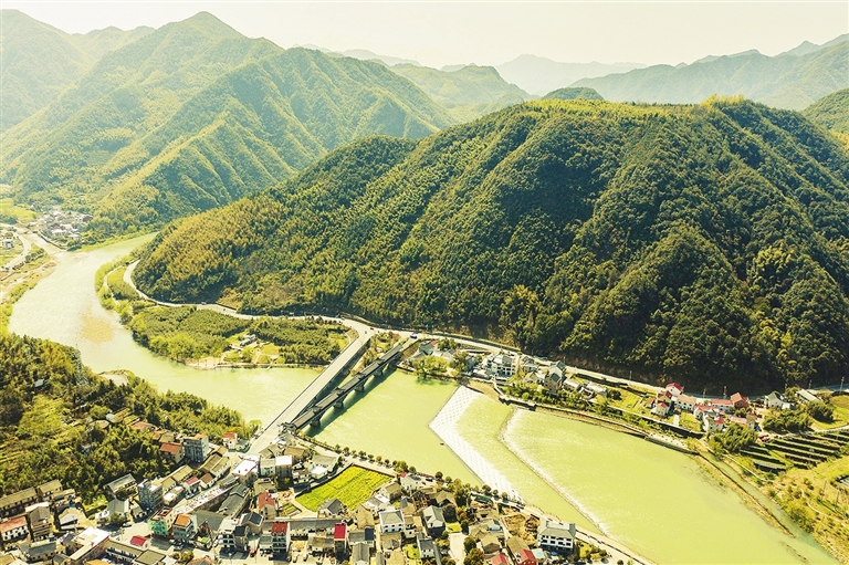 ■空中俯瞰浙江省杭州市富阳区湖源乡壶源溪龙鳞坝。近年来,湖源乡积极推进“美丽河湖”建设,开展全流域治水行动,拆迁沿岸多家污染企业及小水电站,在壶源溪湖源段兴建水坝,实现“堤固、水畅、岸稳、安全”的河道治理目标,也为当地增加了旅游景观资源。新华社 发