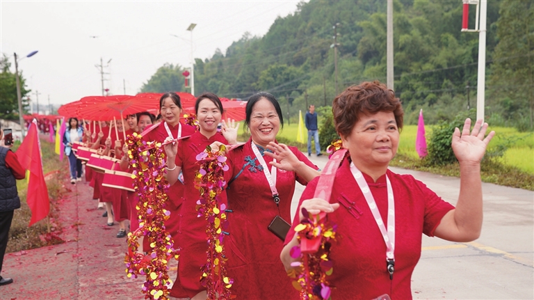 21日早上8时,外嫁女们盛装打扮,有的手持“月是故乡圆、情亦故土深”等思乡红牌,有的肩担竹篮,在醒狮鼓乐的引领下,从村委会出发,途经汉塘、石背、竹头围、黄泥塘、上坑、下坑、司马第、花树下、中心厂、新寨,一路赏红花之风景,敬奉红花之祖宗,问候乡里故人,共同感受红花村乡村振兴新成效新变化。