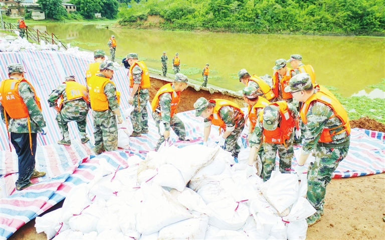 ■6月15日,和平县组织民兵到礼士镇对黄茅水库进行抢险修复。据悉,黄茅水库为小Ⅱ型水库,为均质土坝,由于连续强降雨导致主坝左岸坝后坡漏水严重。险情发生后,县委、县政府高度重视,为保证大坝安全及水库下游群众生命安全,及时采取了科学有效的措施降低水库水位。通讯员 陈永生 摄