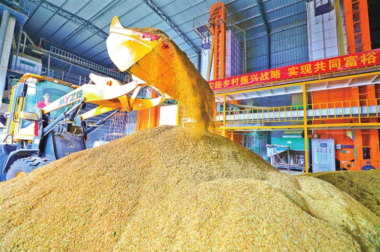 ■粮食丰收,百姓增收。图为龙川县龙母镇众合粮食加工厂生产车间。