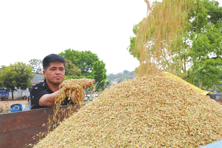 ■2025年4月,龙川县千亩冬小麦成熟收割,这是该县首次大面积冬种小麦并获得丰收。首次种植成功后,龙川县农业部门在全县推广冬种小麦,让耕地不“闲”,进一步筑牢粮食生产底盘。