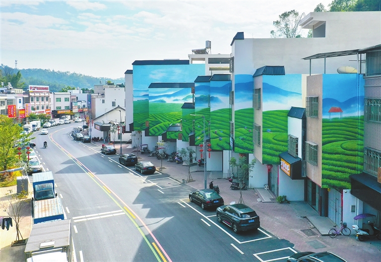 ■2024年年底,由11面墙体连成的巨型山水茶园墙绘点“靓”紫金县龙窝圩镇。画中云雾缭绕的茶园层层叠叠,成了“中国蝉茶之乡”最鲜活的名片。