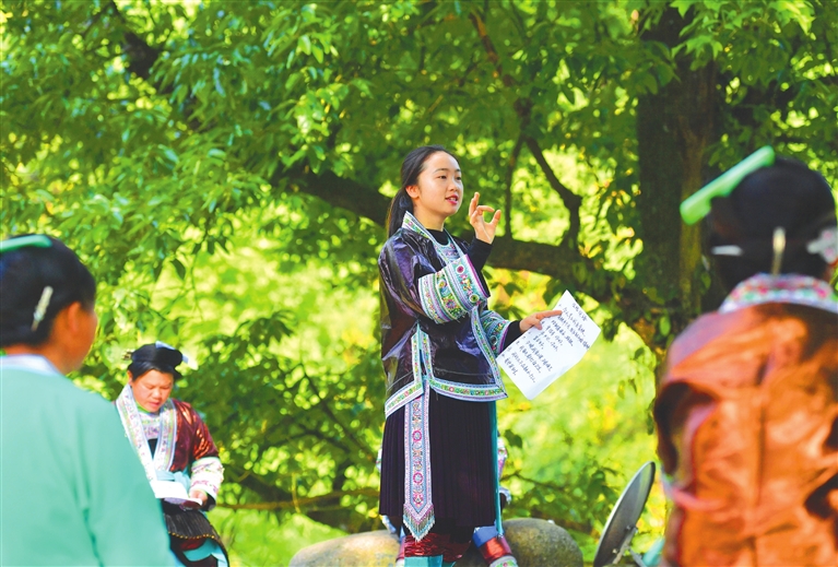 在党鸠村桂黔乌英苗寨的一棵大枫树下,梁孟香在培训公开课上讲课。