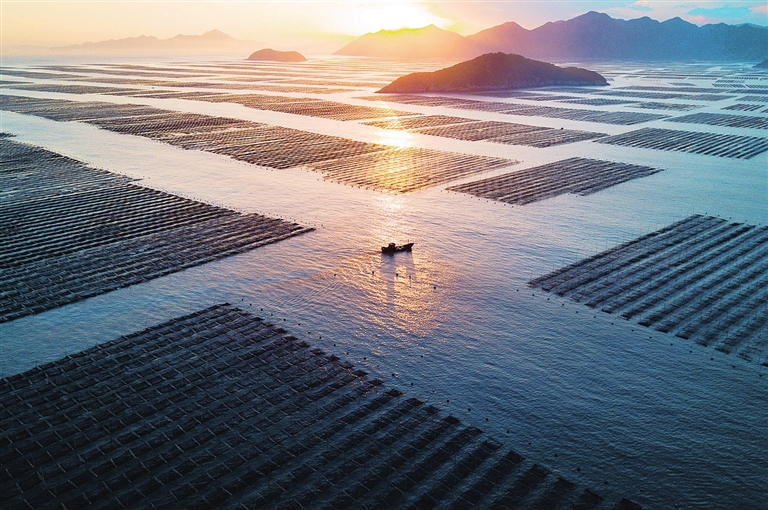 ■在宁德市霞浦县三沙镇闽东渔场,渔船在夕阳余晖下 归港(2020年11月26日摄)。