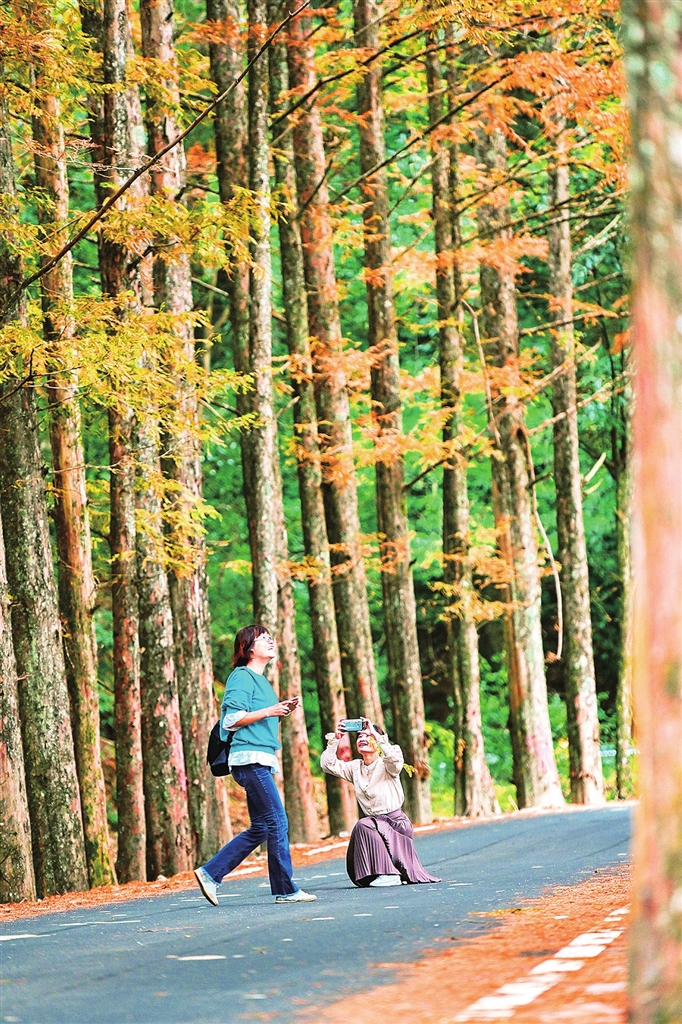 ■游客在三明市将乐县龙栖山国家级自然保护区水杉大道游览(2020年11月19日摄)。