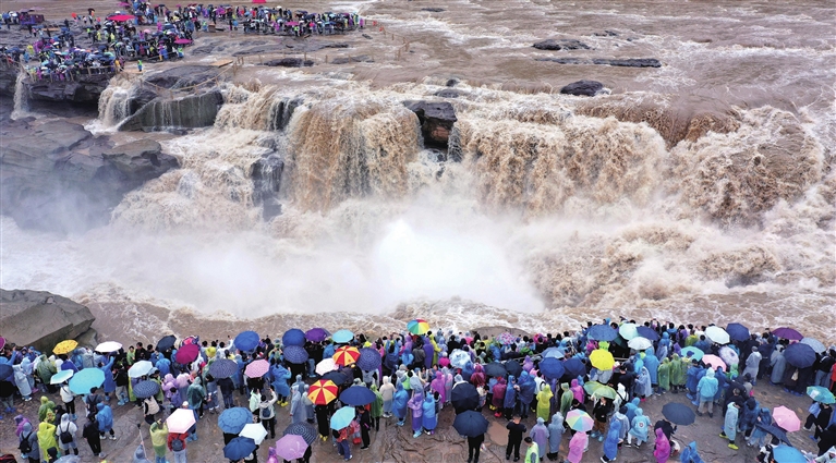 ■10月5日,游客在山西吉县黄河壶口瀑布景区观瀑(无人机照片)。