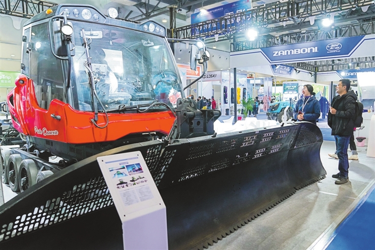 12月18日,参观者在第九届吉林冰雪产业国际博览会现场向工作人员咨询一款国产压雪车的性能指标。