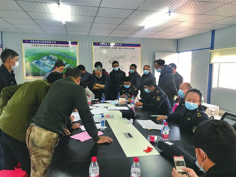■在某工程部,执法人员在了解农民工欠薪情况。