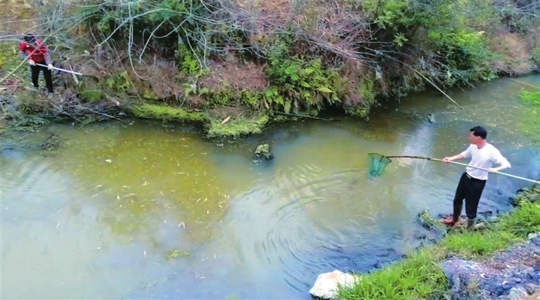 ■邓崇福(右)在紫金县凤安镇仁里村清理河道,开展农村人居环境整治。