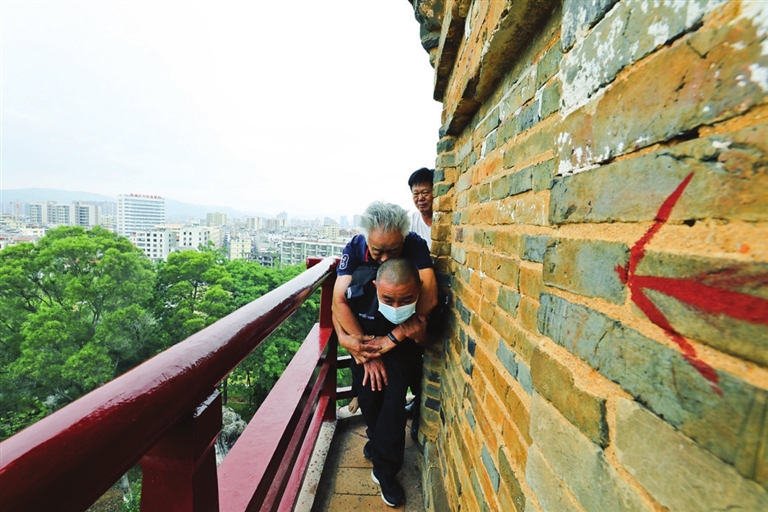 当天上午10时许,来自揭阳的69岁曾伯在家人陪伴下前往龟峰公园游玩并登塔观光。当上到第四层时,曾伯出现眩晕,其家人马上拨打120求救。5分钟后,医护人员到达现场,爬上塔对曾伯作了初步检查,疑似低血糖引起眩晕,经询问得知其做过心脏搭桥手术。由于塔内通道只能容一人行走,无法使用担架。此时,河源恐龙博物馆保安周四才主动提出背老人下塔。由于老人失禁,周四才的衣裤被弄湿弄脏,但他毫不计较,成功将老人背到塔下。本报记者 冯晓铭 摄