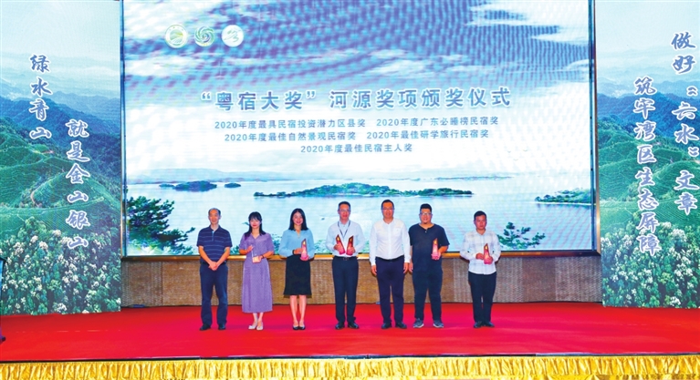 颁奖现场,东源县获评2020年度最具民宿投资潜力区县奖;梨花屋舍民宿、迴響民宿、和平县合水玫花渡民宿获评2020年度广东必睡榜民宿奖;梨花屋舍民宿获评2020年度最佳自然景观民宿奖;乡村四月民宿获评2020年度最佳研学旅行民宿奖;仙塘山居民宿获评2020年度最佳民宿主人奖。