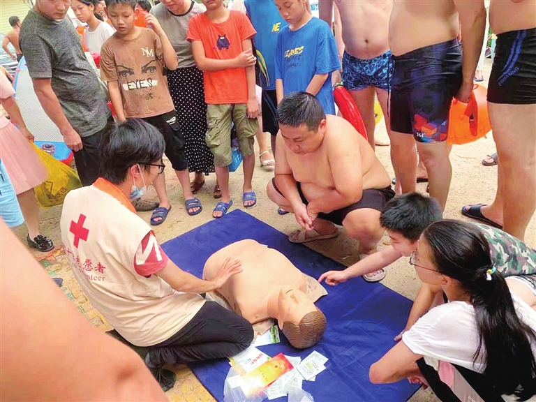 据了解,市红十字会工作人员和志愿者对江边无家长带领的未成年人进行劝返,对游泳爱好者进行游泳安全知识宣传。同时,还设置了志愿服务宣传咨询点,向市民详细讲解对溺水者进行心肺复苏术的操作要点和注意事项,用模拟人教具演示心脏复苏的实际操作,手把手地教群众进行心肺复苏施救。