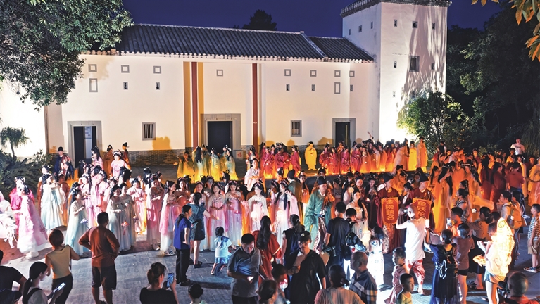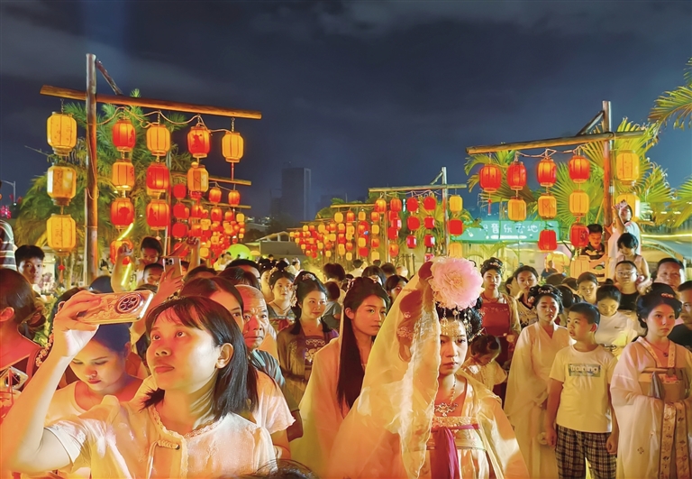 ■10月4日晚,万绿湖镜花缘游览区“镜花水月·古风夜游”汉服巡游活动吸引了众多游客参与。