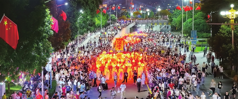 ■10月3日晚,“江湖渔火 太平夜市”河源第二届鱼灯夜游活动在市区新丰江畔举行,江上鱼灯巡游、无人机表演、烟花秀等水陆空展演,吸引了12.5万名市民和游客观看,成为假期当之无愧的“顶流”。