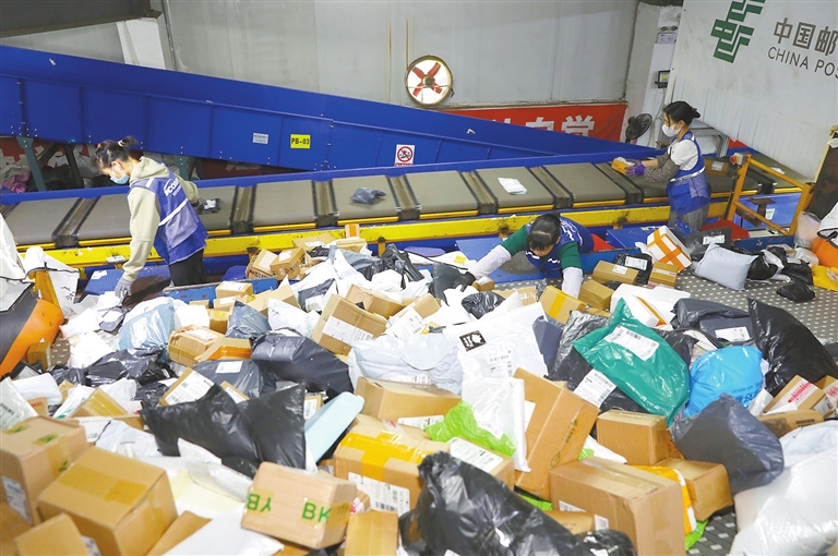 据市邮政管理局统计数据,“双12”期间,全市快递业务量日均104.33万件,比去年同期增长1.53%,预计快递量高峰将持续到本月底。本报记者 肖斌 摄