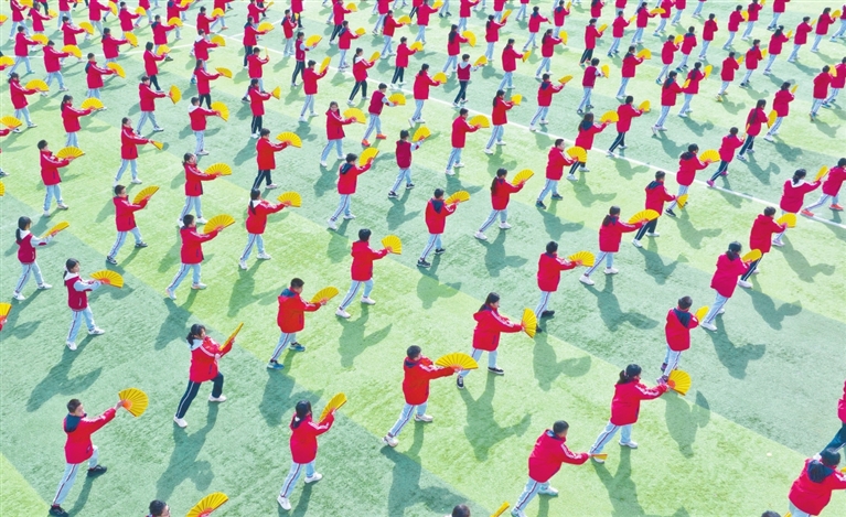 ■河源广赋创新学校第六届体育节上,学生们在展示《扇子操》。