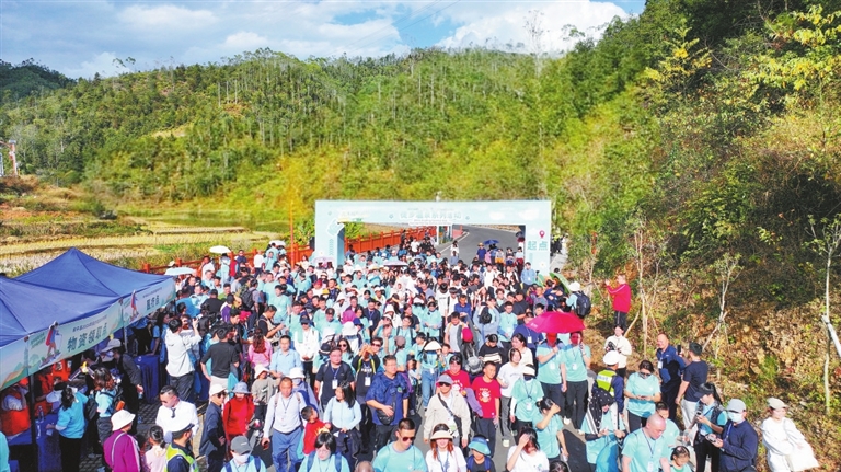 ○本报讯 记者 陈星 昨日,“漫步绿美合水·共沐福和温情”和平县2025年徒步温泉系列活动启动。来自深圳、河源及其他周边城市的1000多名徒步爱好者,用脚步丈量和平县合水镇的绿水青山(下图。冯晓铭 摄),沉浸式体验“百千万工程”带来的乡村新变化,走进和平县绿美生态建设的动人画卷。