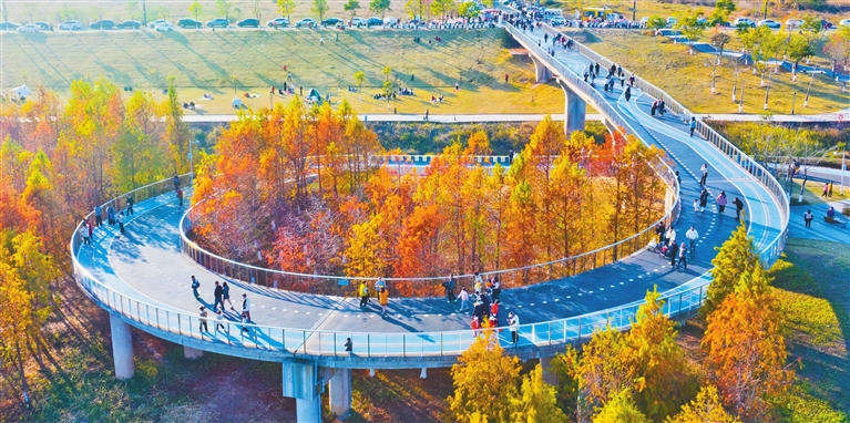 ■河源国家高新区白鹭岛公园落羽杉换上“冬装”,市民们在尽情享受这如诗如画的美景。