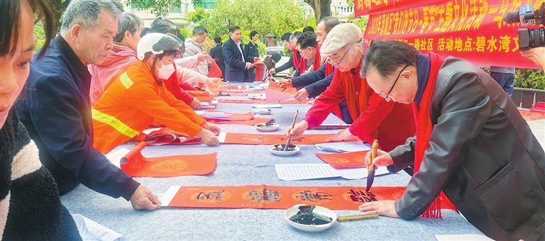 活动主办方为优秀党员、优秀教师、医务人员、环卫工人、外卖员、保安员等基层一线代表赠送了春联和“福”字,给这些平凡岗位上的奉献者送上新年祝福。随后,书法家现场挥毫泼墨,免费为市民书写春联和“福”字,笔走龙蛇间,尽显吉祥团圆之意,饱含着对未来的美好期盼。