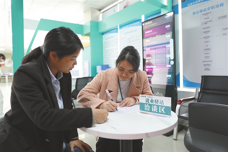 ■在源城区丰源社区就业驿站洽谈区,工作人员指导求职者填写求职登记表。本报记者 林梓楷 摄