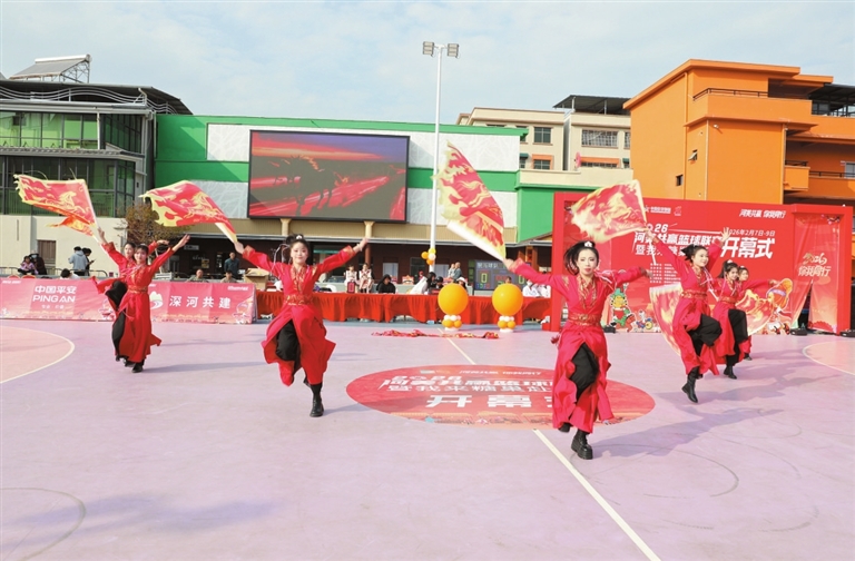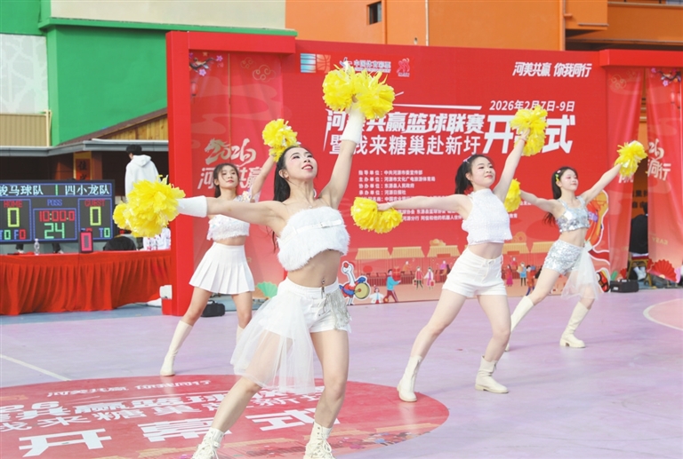 2026河美共赢篮球联赛开幕式在东源糖巢创客社区拉开帷幕。赛场周边人声鼎沸,身着各色队服的球员三五成群地交流和热身,观众的欢声笑语交织在一起,提前点燃了现场的热烈氛围。