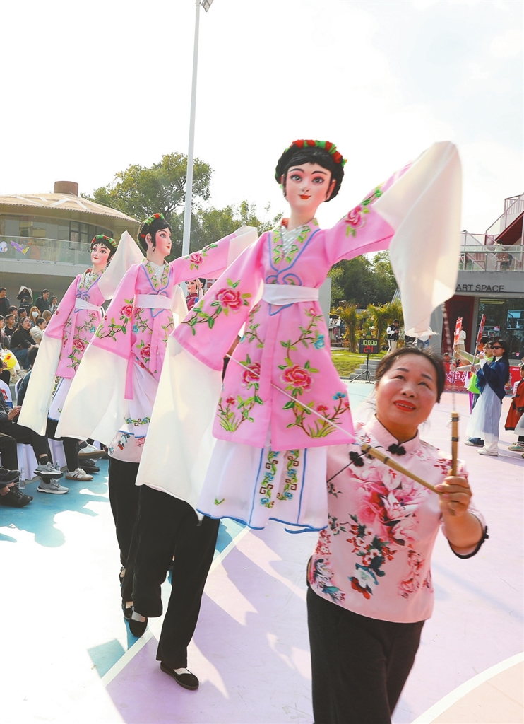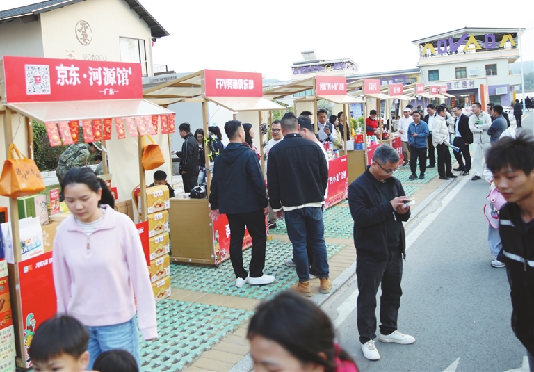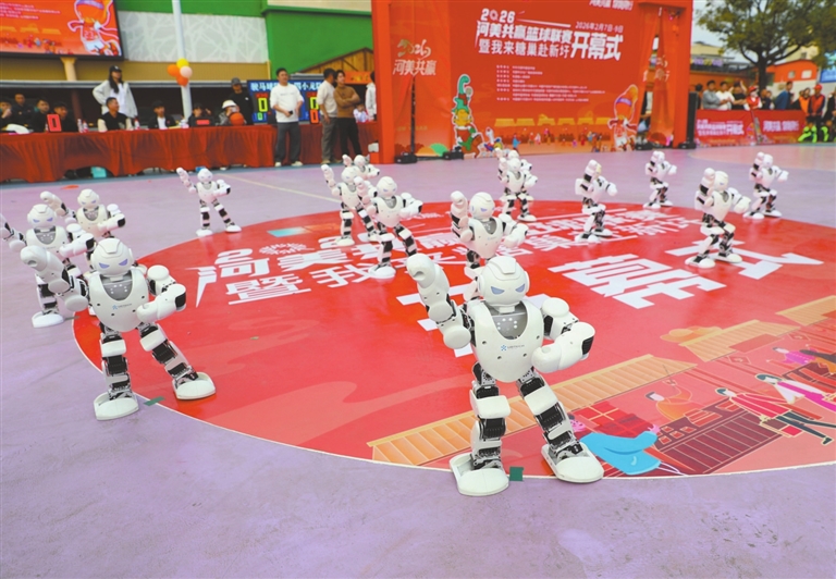 赛场周边的活动区同样热闹非凡。写春联的摊位前,几位书法爱好者挥毫泼墨,笔走龙蛇间,一副副寓意吉祥的春联新鲜出炉,墨香混合着空气中弥漫的客家黄酒的醇香、板栗仁的焦香,勾勒出浓郁的年味。市民排着队领取春联,孩子们则被灵动可爱的小机器人表演吸引,围在舞台前拍手叫好,机器人随着音乐扭动身躯,做出投篮、跳舞等趣味动作,不时引发阵阵欢笑。河源土特产展示区里,丝苗米颗粒饱满,河鱼干散发着自然的鲜味……摊主热情地向过往市民介绍产品,试吃、选购的市民络绎不绝。