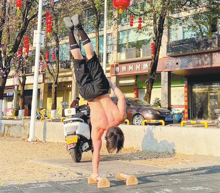 据了解,李先生祖籍安徽,已随父母在河源安家,目前在武汉工作,每年仅春节返乡团聚。此次参与健身秀的5人因运动结缘,趁着新春佳节相聚河源,以健身会友。“我从17岁开始健身,坚持了9年。” 李先生说,学生时代的他性格内向,缺乏自信。接触健身后,不仅练出了强健体魄,更在日复一日的坚持中找回自信与成就感,近两年来热衷街头极限健身,不断挑战自我。