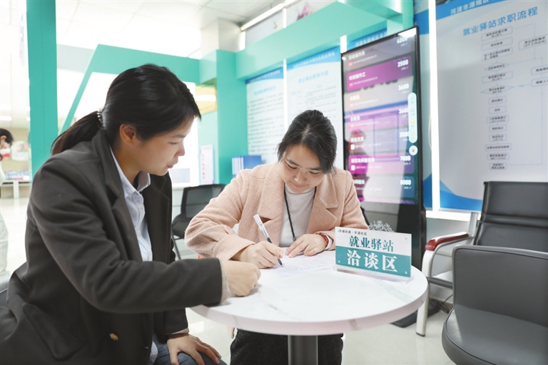 ■在源城区东埔街道丰源社区就业驿站洽谈区,工作人员指导求职者填写求职登记表。