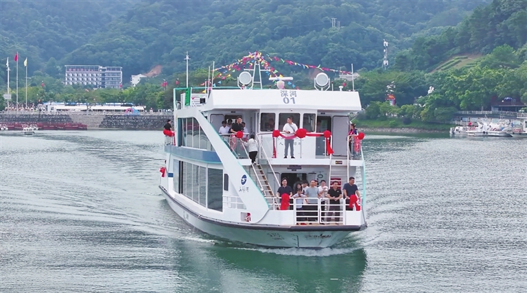 ■去年9月27日,由深河指挥部支持打造的新能源游船“深河01”号(196座),在万绿湖景区旅游码头鸣笛启航。本报记者 杨坚 摄